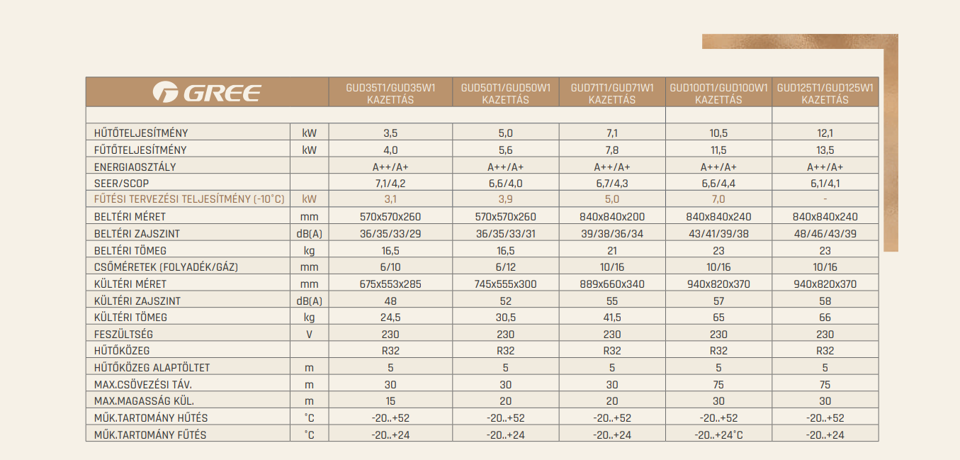 A Gree GUD125T / GUD125W Kazettás Split klíma fontos tulajdonságai: