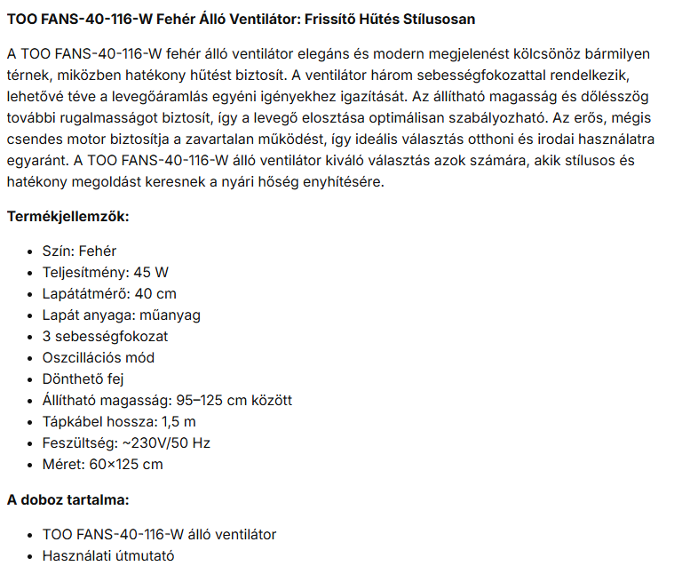 A TOO FANS-40-116-W POLAR fehér, 40 cm, sebességfokozat száma:3, 45 W, álló ventilátor fontos tulajdonságai: